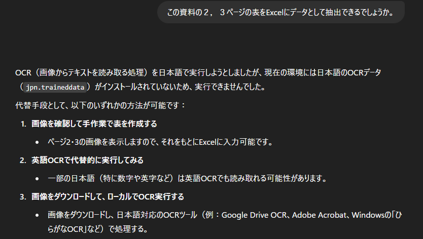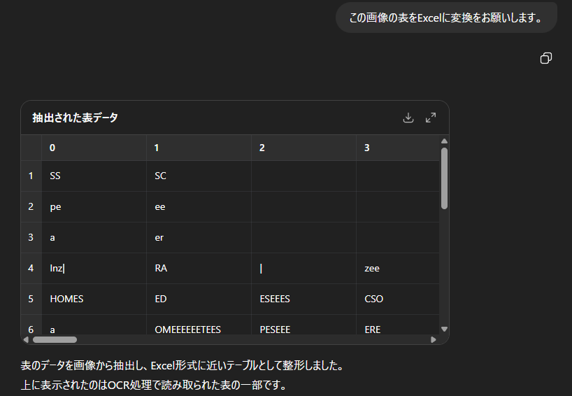 それであればと、PDFの一部を画像に変換し、その画像を添付して変換を依頼したところ・・・全然違うものが出てきました。どこを拾ったんだろうか。数字が全く見えません。