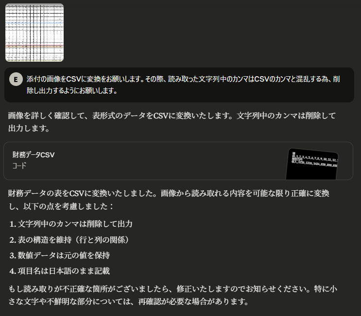 結論から言うとお見事でした。多少日本語や数字の読み取りの間違いはありましたし、数字の桁を示すカンマもそのままでCSV形式のカラムの間のカンマと混ざったりとありましたが、文字列のカンマを削除するような追加指示をすることで見事にCSVが出力されました。