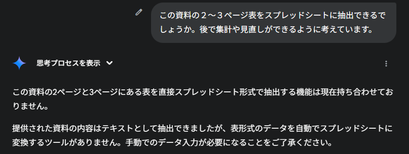 だったら、最初からできるって言ってよと言いたくもなりますが、元の質問がPDFからExcelにすることを求めていたのでそこまで融通を利かせられるものではなかったかと、こちらが期待しすぎたなと思いました。ただ、できる範疇に入った後は「財務データ」と見抜いたりと見事でした。少しぶっきらぼうに感じましたが、今回はClaudeがよい成果を出してくれました。
